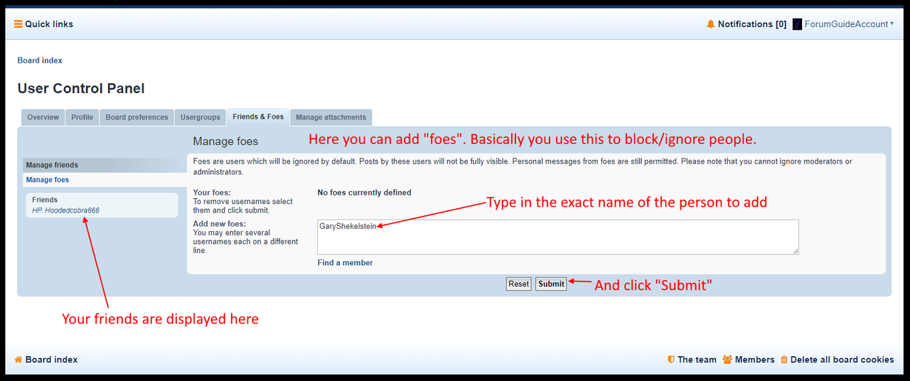 On the “Friends & Foes” tab in the User Control Panel, you can add Friends and Foes. Friends will be displayed on the left side of the User Control Panel regardless of what tab you are in, so that you can jump to their profiles easily. Foes will have their posts made partially invisible from you, so you can put people who annoy you on this list if you want to.