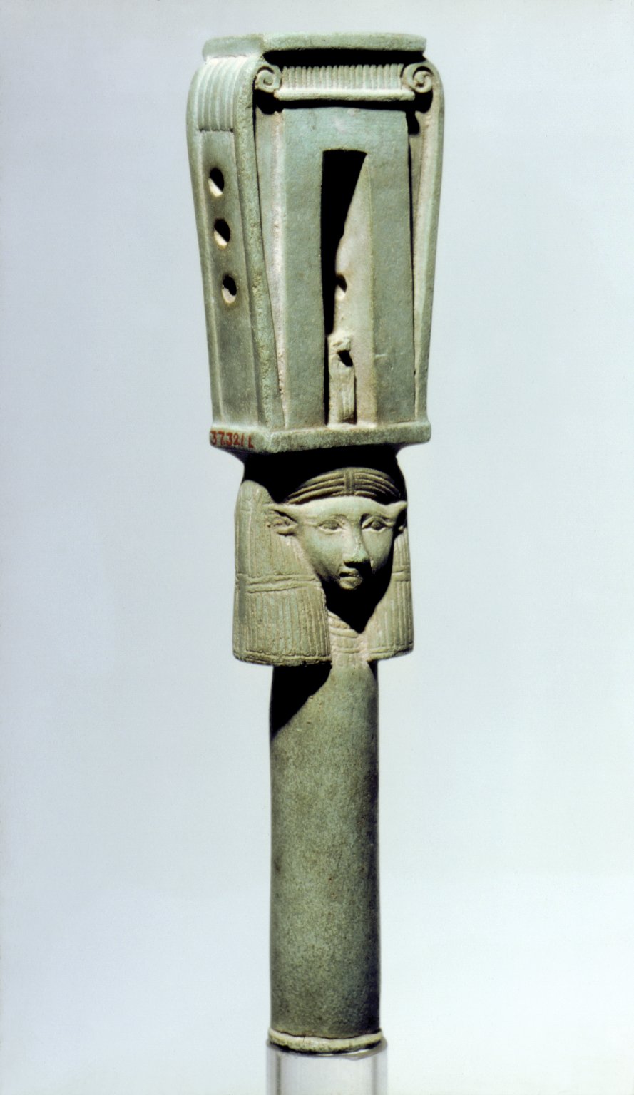 As Plutarch records, both Isis and Nephthys were typically shown on the sistrum with one face of Isis on one side and the other with Nephthys’ likeness, often interchangably with Hathor. Nephthys is also occasionally shown with the crown of Ma’at adorned with two feathers, illustrating the ability for Her to intercede for the dead.