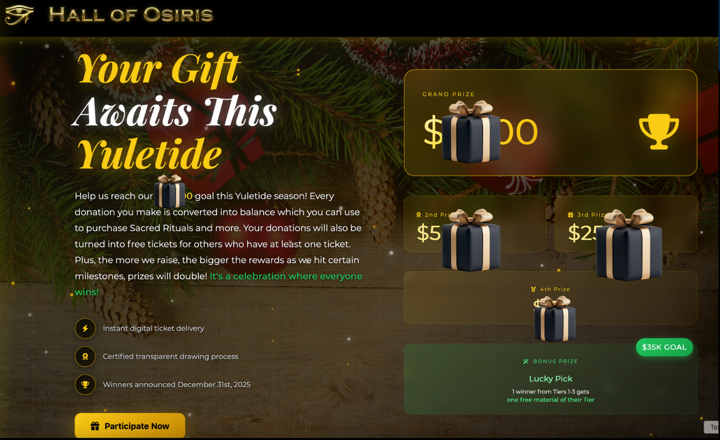 The time has come this year to give gifts, venerate the Gods and celebrate the festive season. As with any year, our holiest day at December 23rd is nearby and with it, will bring the year 2026. Last year, we have done a phenomenal ticket draw in the Hall of Osiris where donors and other people, received many beautiful prices, financial and of other types. It went beautifully and it helped us embrace the celebration of Yuletide, so we are doing this again this year.