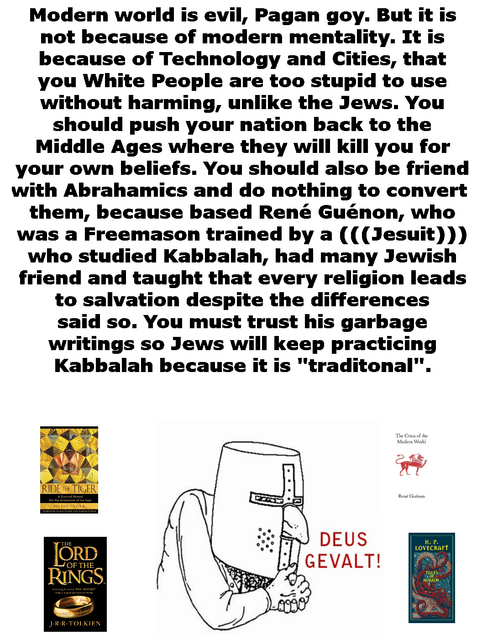 Pretty much explains the average Traditionalist idiocy and of anyone who thinks that technology is the problem. It's not, the problem is the useless part of it, that was created by the Jews. Also, imagine whining about technology while being influenced by media that exists thanks to it (LOTR, any western RPG, Vikings...).