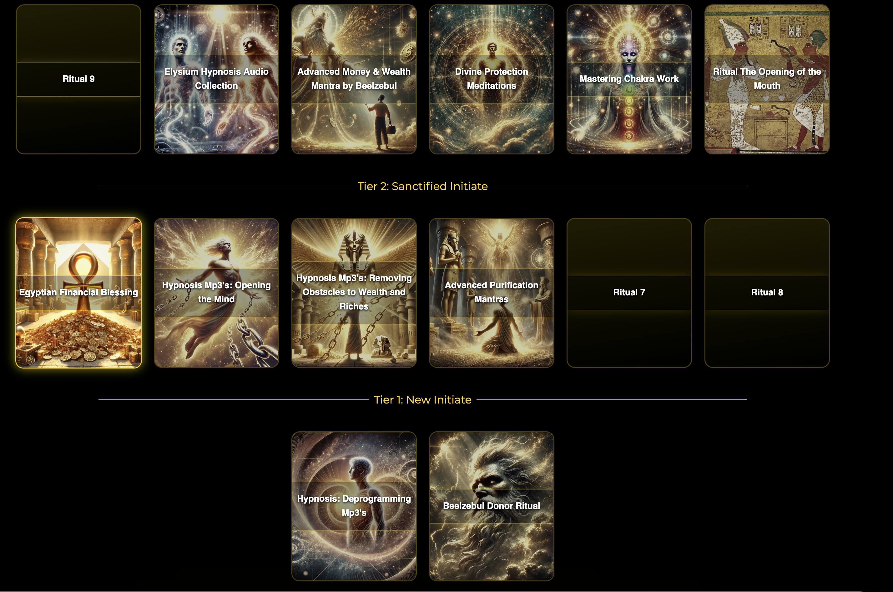 The Tier System through Rituals, blessings, meditations and other advancement, will reassure that anyone who follows it will become a top performing SS. These will be able to be attained either through doing great works for the Gods and the Community, or Financially, or both.