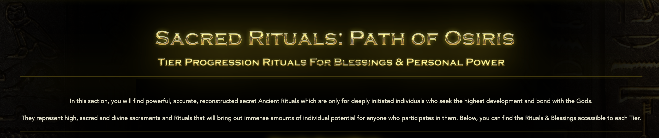 These are important Rituals I reconstructed with the guidance of the eternal God Osiris. Osiris was always the patron of the Pharaonic Mysteries and these are extremely powerful tools that will help you in your life; these are magickal blessings for wealth and finance, improvement, deprogramming the mind, all the way to Tier 4 where we have exceptional Rituals which are Pharaonic and life changing knowledge. This section will be explained in a video so people can know about this.